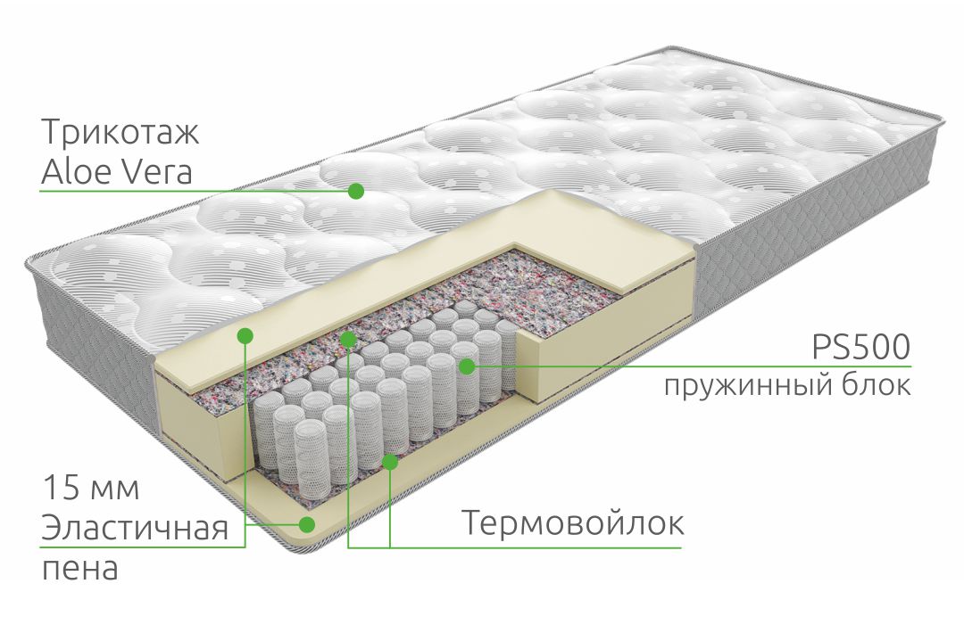 Мягкий недорогой матрас Base 15 на базе независимого пружинного блока PS500 (256 пружин на кв.м). Выдерживает весовую нагрузку до 110 кг на одного спящего.