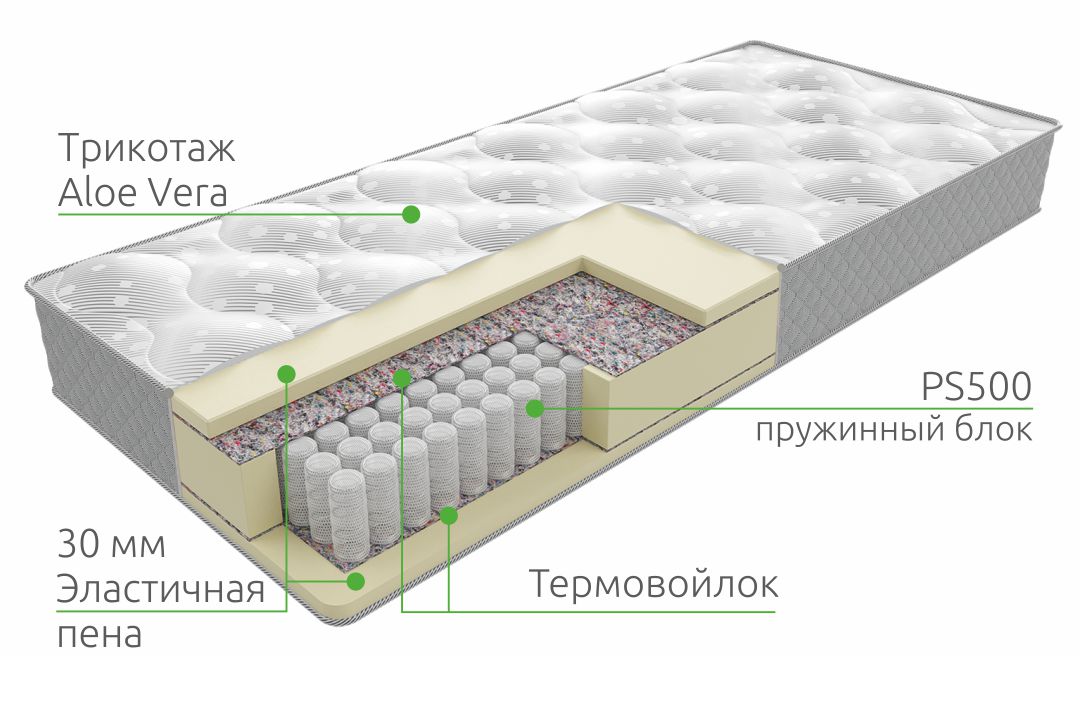 Купить недорого матрас Base 30 PS500 можно в чехле из трикотажа Aloe Vera с объёмной стёжкой на 200 гр. холкона.