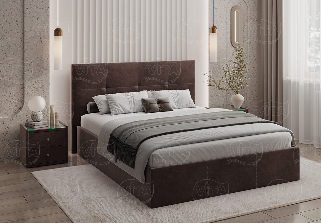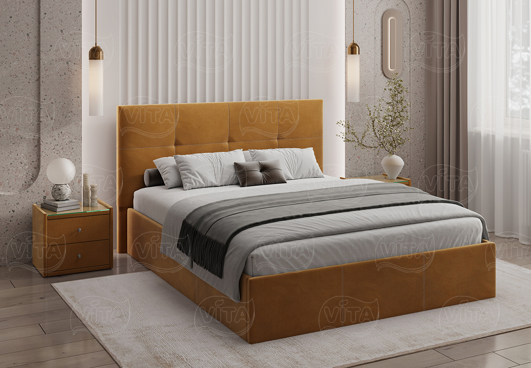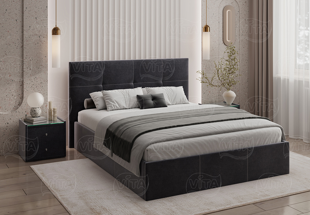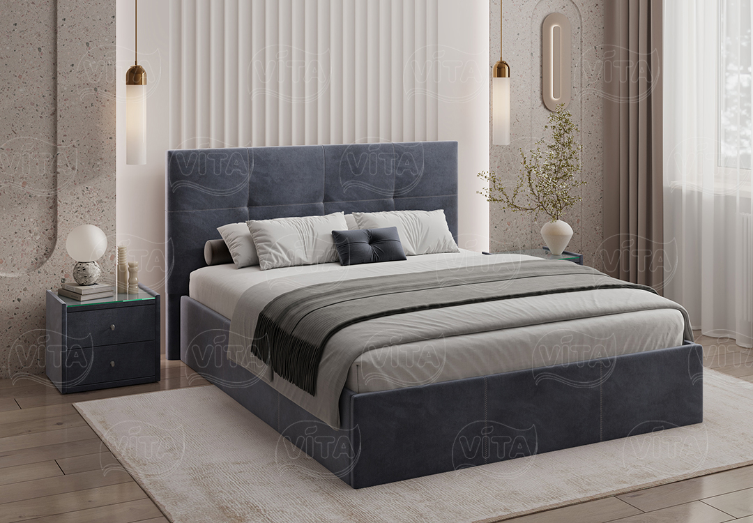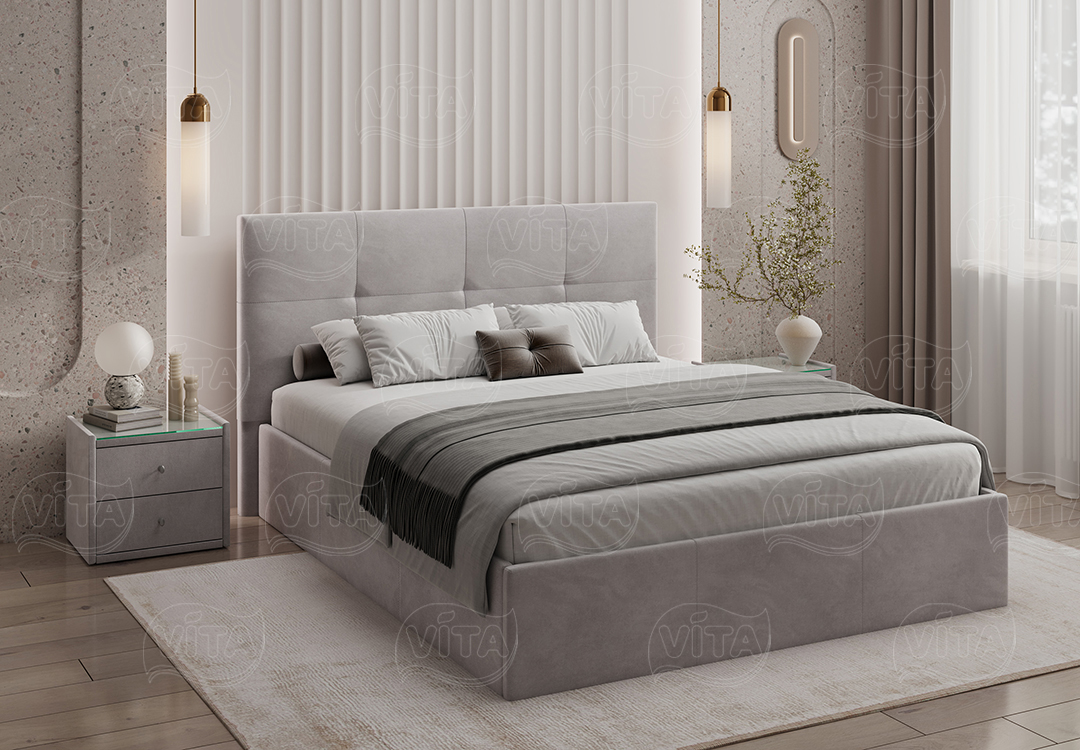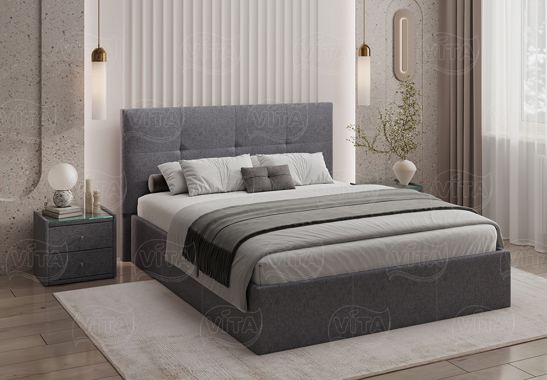 Кровать Ева с ортопедическим основанием и механизмом для подъема. Ящик для белья с прочным дном. Обивка выполнена из износостойкой ткани различных цветов и текстур.